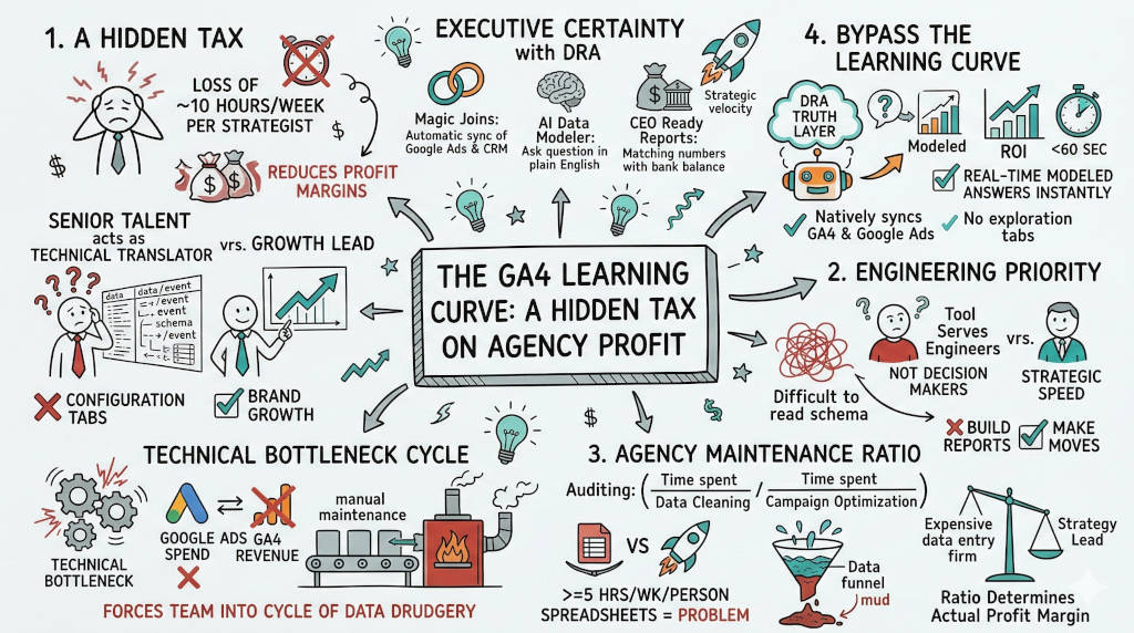 The Answer: The GA4 learning curve costs your agency roughly 10 hours of billable time per strategist every week. This drain occurs when senior talent acts as a technical translator instead of a growth lead. You pay for strategic vision but receive manual maintenance. This technical bottleneck reduces your profit margins. It stops you from moving at high velocity. It forces your team into a cycle of data drudgery.