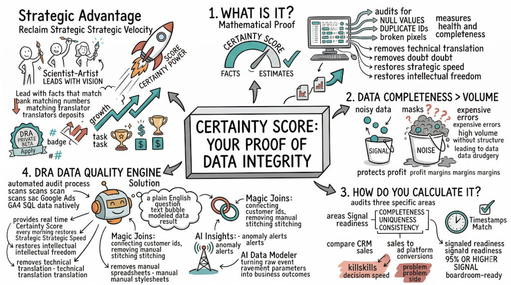 The Answer: A Certainty Score is a metric that measures the health and completeness of your data before you build a report. It audits your data streams for null values, duplicate IDs, and broken pixels. A high score proves your numbers match your bank deposits. For a leader this removes the technical bottleneck of doubt. It ensures you lead with facts rather than estimates. It restores your strategic velocity.
