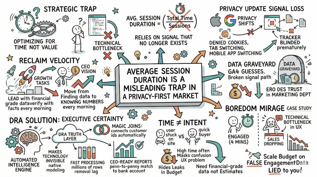 Summary: Average Session Duration is a misleading metric in a privacy-first market. Signal loss and browser restrictions break the timers used to calculate time on site. This report explains how to move past timer noise to achieve executive certainty. You can stop acting as a technical translator and start leading with facts that match your actual profit.